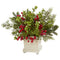 This single faux magnolia bloom is stunning in its simplicity. Surrounded by a green pine and red berry arrangement, it is a perfect addition for the months of winter. Place several on the mantle above a crackling fire! The clear glass cube reflects fire and candle light for a warm and intimate feel. Perfect for your beach house at the Holidays!